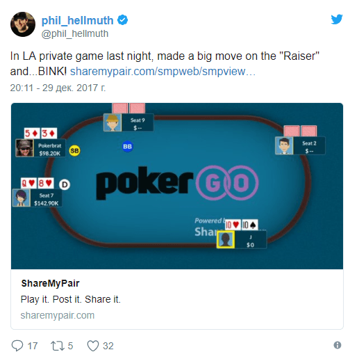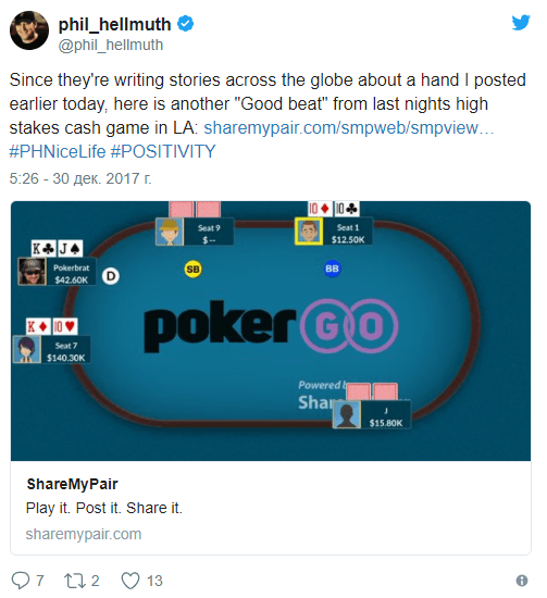 Фил Хельмут – успешный и известный американский покерист. На его счету огромное количество побед в живых турнирах. Однако он является участником не только оффлайн-состязаний, но и частных кэш-игр, на которые получают приглашения лишь знаменитости. По инсайдерской информации, Фил часто отыгрывает раздачи за одним столом с владельцем Zynga Марком Пинкусом, создателем Yammer Дэвидом Саксом и другими крупными предпринимателями, а также успешными игроками NBA. Совсем недавно Хельмут решил поделиться со своими поклонниками сразу двумя такими раздачами: