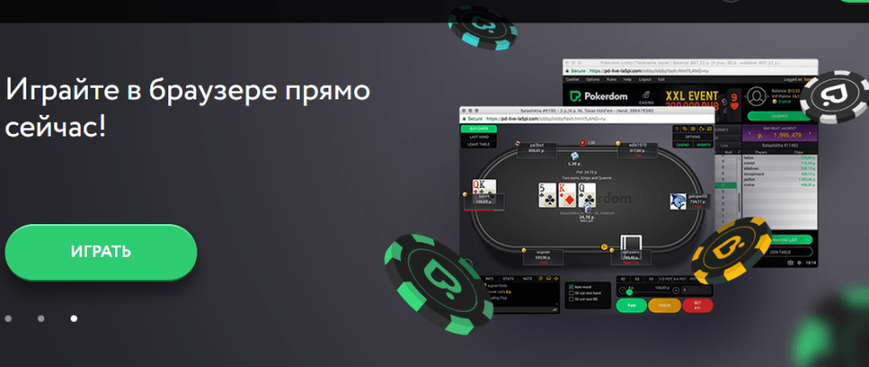 В онлайн-версии ПО рума выводятся последние акции. Таким образом, вы будете в курсе событий и сможете одним из первых воспользоваться новыми промо-предложениями от PokerDom. В браузерном приложении также доступна информация по вашему ВИП-статусу и накопленным баллам в рамках участия в программе лояльности.