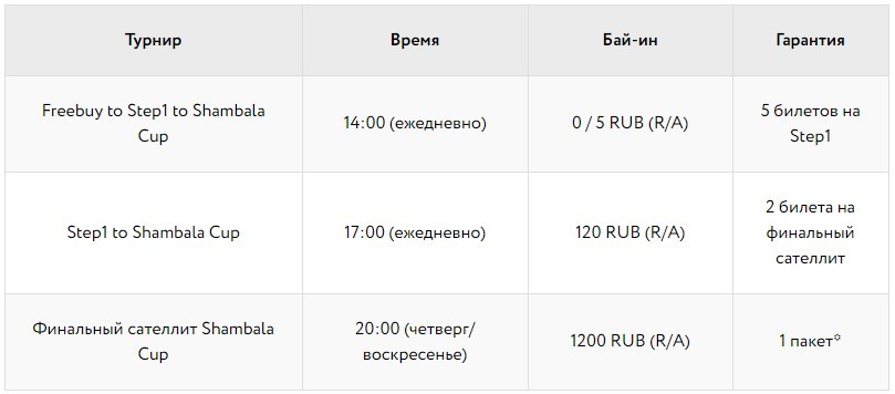 Сателлиты к Shambala Cup проходят в ПокерДом ежедневно. Благодаря им можно отобраться на Главное Событие этой покерной серии, где гарантия составляет 1 000 000 RUB. Расписание сателлитов выглядит таким образом: