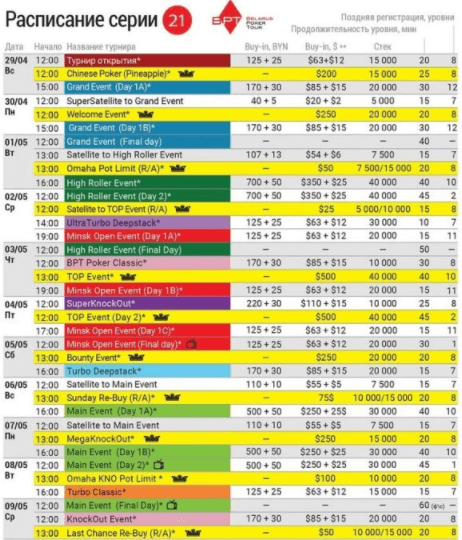 Вступительные взносы к предстоящим сателлитам будут начинаться от 20 долларов. Отборочные турниры начнут проходить в руме с 7 апреля. Сама же живая серия стартует 29 апреля и завершится 9 мая. Она пройдет в Минске. Расписание турниров BPT выглядит следующим образом: